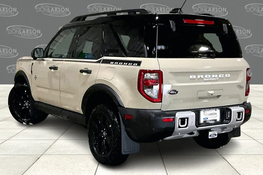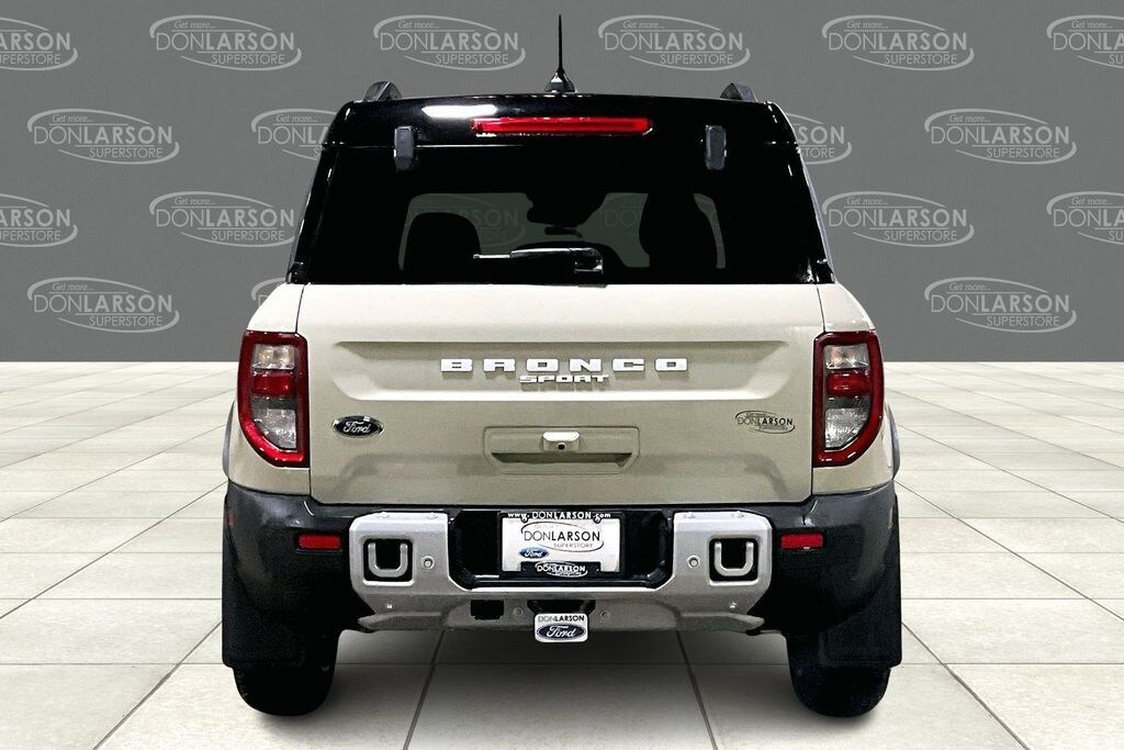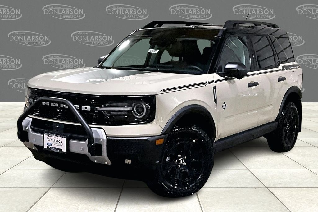 Desert Sand 110V/400W AC Power Outlet, 2nd Row Carpeted Seatback, 360-Degree Camera w/Trail & Split View, 4-Wheel Disc Brakes, 6 Speakers, ABS brakes, Air Conditioning, Alloy wheels, AM/FM radio: SiriusXM, AM/FM Stereo, Auto High-beam Headlights, Auto-dimming Rear-View mirror, Automatic temperature control, Auxiliary Switches & Wiring, B&O Sound System by Bang & Olufsen, Brake assist, Brush Guard, Class II Trailer Tow Pack w/Trailer Sway Control, Compass, Connected Navigation, Delay-off headlights, Driver door bin, Driver vanity mirror, Dual front impact airbags, Dual front side impact airbags, Electronic Stability Control, Emergency communication system: SYNC 4 911 Assist, Equipment Group 300A, Fender Tie Downs, Four wheel independent suspension, Front & Rear Black Bumpers, Front & Rear Splash Guards, Front anti-roll bar, Front Bucket Seats, Front Center Armrest, Front Driver/Passenger Seat Back Map Pockets, Front dual zone A/C, Front fog lights, Front License Plate Bracket, Front Parking Sensors, Front reading lights, Fully automatic headlights, Garage door transmitter, HD Radio, Heated door mirrors, Heated front seats, Heated steering wheel, High Clearance Fender Flares, HOSS 2.0 Off-Road Suspension, Illuminated entry, Interior Grab Handle, Knee airbag, Low tire pressure warning, Memory seat, Occupant sensing airbag, Outer Banks Tech Package+, Outside temperature display, Overhead airbag, Overhead console, Panic alarm, Passenger door bin, Passenger vanity mirror, Power door mirrors, Power driver seat, Power Moonroof, Power passenger seat, Power steering, Power windows, Premium Trimmed Front Bucket Seats w/Ebony/Roast, Radio data system, Rain sensing wipers, Rear anti-roll bar, Rear Parking Sensors, Rear reading lights, Rear seat center armrest, Rear window defroster, Rear window wiper, Recovery Hooks, Remote keyless entry, Reverse Brake Assist, Sasquatch Outer Banks Package, Security system, SiriusXM, Speed control, Speed-sensing steering, Speed-Sensitive Wipers, Split folding rear seat, Steering wheel mounted audio controls, SYNC 4 w/Enhanced Voice Recognition, Tachometer, Telescoping steering wheel, Tilt steering wheel, Topo Graphic Package, Traction control, Trail Control for Off-Road, Trip computer, Variably intermittent wipers, Wheels: 17" Ebony Black-Painted Aluminum, Wheels: 18" Ebony Black-Painted Aluminum. 25/30 City/Highway MPG 2025 Ford Bronco Sport Outer Banks 4WD 8-Speed Automatic 1.5L EcoBoost