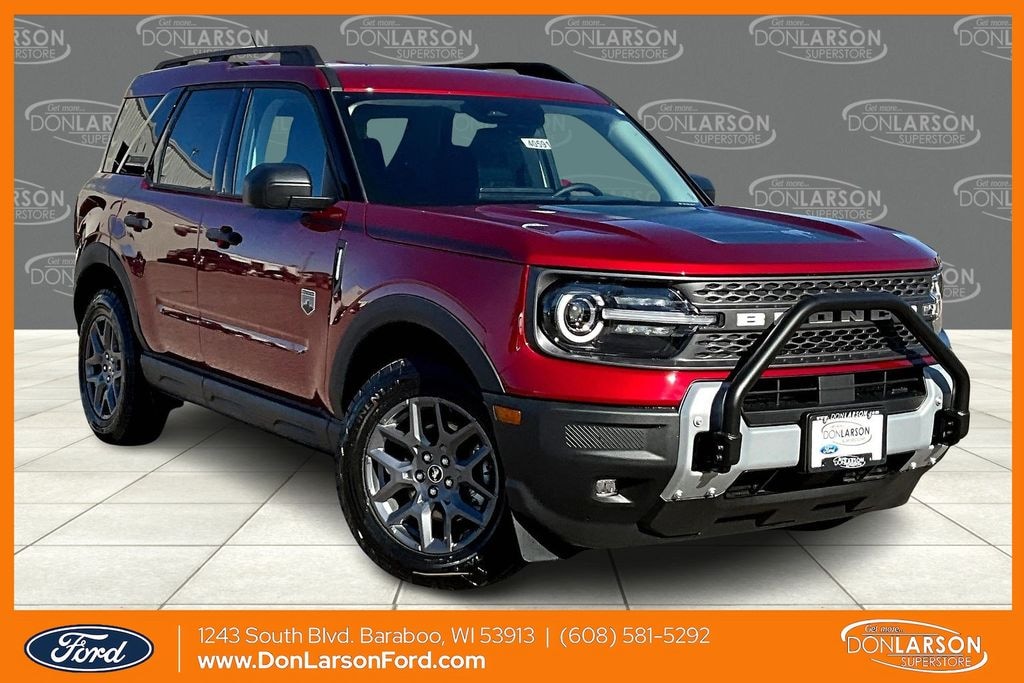 Ruby Red 4-Wheel Disc Brakes, 6 Speakers, ABS brakes, Air Conditioning, Alloy wheels, AM/FM radio: SiriusXM, AM/FM Stereo, Auto High-beam Headlights, Automatic temperature control, Brake assist, Cloth w/Easy-to-Clean Front Bucket Seats, Compass, Delay-off headlights, Driver door bin, Driver vanity mirror, Dual front impact airbags, Dual front side impact airbags, Electronic Stability Control, Emergency communication system: SYNC 4 911 Assist, Four wheel independent suspension, Front anti-roll bar, Front Bucket Seats, Front Center Armrest, Front reading lights, Fully automatic headlights, Heated door mirrors, Illuminated entry, Knee airbag, Low tire pressure warning, Occupant sensing airbag, Outside temperature display, Overhead airbag, Overhead console, Panic alarm, Passenger door bin, Passenger vanity mirror, Power door mirrors, Power steering, Power windows, Radio data system, Rear anti-roll bar, Rear Parking Sensors, Rear reading lights, Rear seat center armrest, Rear window defroster, Rear window wiper, Remote keyless entry, Security system, SiriusXM, Speed control, Speed-sensing steering, Speed-Sensitive Wipers, Split folding rear seat, Steering wheel mounted audio controls, SYNC 4 w/Enhanced Voice Recognition, Tachometer, Telescoping steering wheel, Tilt steering wheel, Traction control, Trip computer, Variably intermittent wipers, Wheels: 17" Carbonized Gray-Painted Aluminum. 25/30 City/Highway MPG 2025 Ford Bronco Sport Big Bend 4WD 8-Speed Automatic 1.5L EcoBoost