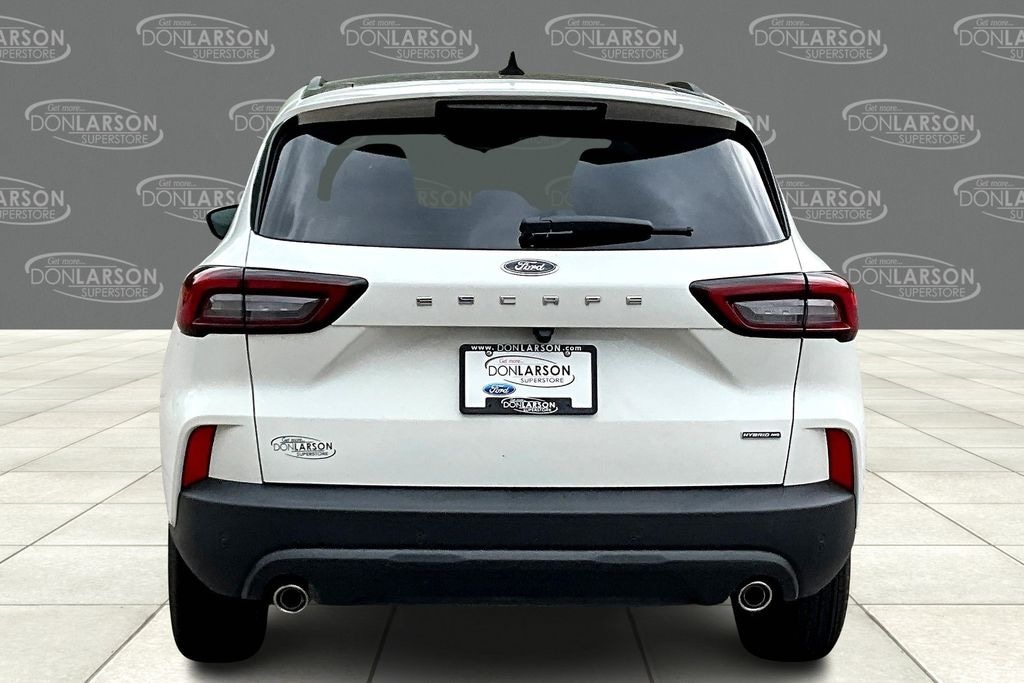 Star White Metallic Tri-Coat 2.5L iVCT, 2.91 Axle Ratio, 4-Wheel Disc Brakes, 6 Speakers, ABS brakes, Adaptive Cruise Control w/Stop-and-Go, Air Conditioning, Alloy wheels, AM/FM radio: SiriusXM, AM/FM Stereo, Auto High-beam Headlights, Automatic temperature control, Black Roof-Rack Side Rails, Brake assist, Bumpers: body-color, Compass, Connected Navigation, Delay-off headlights, Driver door bin, Driver vanity mirror, Dual front impact airbags, Dual front side impact airbags, Electronic Fuel Door Release, Electronic Stability Control, Emergency communication system: SYNC 4 911 Assist, Equipment Group 400A, Ford Co-Pilot360 Assist+, FordPass Connect, Four wheel independent suspension, Front anti-roll bar, Front Bucket Seats, Front Center Armrest, Front dual zone A/C, Front fog lights, Front License Plate Bracket, Front reading lights, Fully automatic headlights, Heated door mirrors, Heated front seats, Heated steering wheel, Heated Vinyl/Cloth Front Sport Contour Bucket Seats, Illuminated entry, Intersection Assist, Knee airbag, Low tire pressure warning, Neutral Towing Capability, Occupant sensing airbag, Outside temperature display, Overhead airbag, Overhead console, Panic alarm, Panoramic Vista Roof, Passenger door bin, Passenger vanity mirror, Pedestrian Alert Sounder, Power door mirrors, Power driver seat, Power Liftgate, Power steering, Power windows, Predictive Speed Assist, Radio data system, Rear anti-roll bar, Rear Parking Sensor, Rear reading lights, Rear seat center armrest, Rear window defroster, Rear window wiper, Rear-View Camera, Remote keyless entry, Speed control, Speed-sensing steering, Speed-Sensitive Wipers, Split folding rear seat, Spoiler, Sport steering wheel, Steering wheel mounted audio controls, SYNC 4, SYNC 4 w/Enhanced Voice Recognition, Tachometer, Tech Pack #1, Telescoping steering wheel, Tilt steering wheel, Traction control, Trip computer, Variably intermittent wipers, Wheels: 18" Rock Metallic Painted Aluminum, 2.5L iVCT. 42/36 City/Highway MPG 2025 Ford Escape Hybrid ST-Line Select AWD eCVT 2.5L iVCT