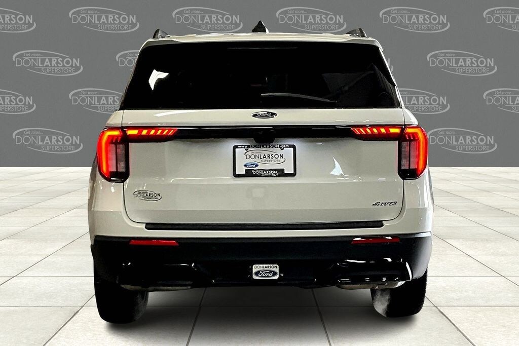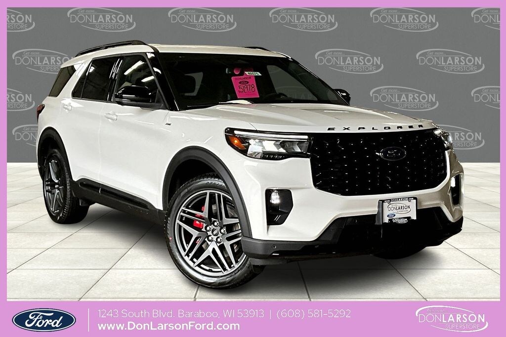 Recent Arrival! Star White Metallic Tri-Coat 4WD, 10 Speakers, 3.58 Non-Limited Slip Rear Axle, 3rd row seats: bench, 4-Wheel Disc Brakes, ABS brakes, Air Conditioning, Alloy wheels, AM/FM radio: SiriusXM with 360L, Apple CarPlay/Android Auto, Auto High-beam Headlights, Automatic temperature control, Brake assist, Bumpers: body-color, Compass, Delay-off headlights, Driver door bin, Driver vanity mirror, Dual front impact airbags, Dual front side impact airbags, Electronic Stability Control, Emergency communication system: 911 Assist, Exterior Parking Camera Rear, Four wheel independent suspension, Front anti-roll bar, Front Bucket Seats, Front Center Armrest, Front dual zone A/C, Front fog lights, Front reading lights, Fully automatic headlights, Garage door transmitter, Heated door mirrors, Heated front seats, Heated steering wheel, Heated Unique Cloth Captain's Chairs, Illuminated entry, Knee airbag, Leather steering wheel, Low tire pressure warning, Navigation System, Occupant sensing airbag, Outside temperature display, Overhead airbag, Overhead console, Panic alarm, Passenger door bin, Passenger vanity mirror, Power door mirrors, Power driver seat, Power Liftgate, Power passenger seat, Power steering, Power windows, Radio: B&O Sound System by Bang & Olufsen, Rear air conditioning, Rear anti-roll bar, Rear reading lights, Rear window defroster, Rear window wiper, Remote keyless entry, Security system, Speed control, Speed-sensing steering, Speed-Sensitive Wipers, Split folding rear seat, Spoiler, Steering wheel mounted audio controls, Tachometer, Telescoping steering wheel, Tilt steering wheel, Traction control, Trip computer, Variably intermittent wipers, Wheels: 20" Ebony-Painted Machined Aluminum, 4WD. 20/27 City/Highway MPG 2025 Ford Explorer ST-Line 4WD 10-Speed Automatic 2.3L EcoBoost I-4