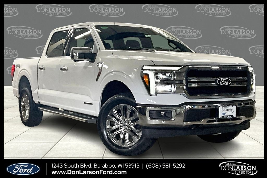 Oxford White 3.5L PowerBoost Full-Hybrid V6, 4WD, 4-Wheel Disc Brakes, 8 Speakers, ABS brakes, ActiveX Trimmed Bucket Seats, Adjustable pedals, Air Conditioning, Alloy wheels, AM/FM radio: SiriusXM with 360L, Auto High-beam Headlights, Auto-dimming door mirrors, Auto-dimming Rear-View mirror, Automatic temperature control, Brake assist, Bumpers: chrome, Chrome wheels, Compass, Delay-off headlights, Driver door bin, Driver vanity mirror, Dual front impact airbags, Dual front side impact airbags, Electronic Stability Control, Emergency communication system: SYNC 4 911 Assist, Equipment Group 501A Mid, Front anti-roll bar, Front Bucket Seats, Front Center Armrest, Front dual zone A/C, Front fog lights, Front License Plate Bracket, Front reading lights, Front wheel independent suspension, Fully automatic headlights, Garage door transmitter, Heated door mirrors, Heated front seats, Heated steering wheel, Illuminated entry, Low tire pressure warning, Memory seat, Navigation system: Connected Navigation, Occupant sensing airbag, Outside temperature display, Overhead airbag, Overhead console, Panic alarm, Passenger door bin, Passenger vanity mirror, Pedal memory, Power door mirrors, Power driver seat, Power passenger seat, Power steering, Power windows, Radio data system, Radio: B&O Sound System by Bang & Olufsen, Rain sensing wipers, Rear reading lights, Rear seat center armrest, Rear step bumper, Rear window defroster, Remote keyless entry, Security system, Speed control, Split folding rear seat, Steering wheel mounted audio controls, SYNC 4 w/Enhanced Voice Recognition, Tachometer, Telescoping steering wheel, Tilt steering wheel, Tow/Haul Package, Traction control, Trip computer, Turn signal indicator mirrors, Variably intermittent wipers, Ventilated front seats, Voltmeter, Wheels: 18" Chrome-Like PVD, Wheels: 20" Chrome-Like PVD, 3.5L PowerBoost Full-Hybrid V6, 4WD. 2025 Ford F-150 Lariat 4WD 10-Speed Automatic 3.5L PowerBoost Full-Hybrid V6