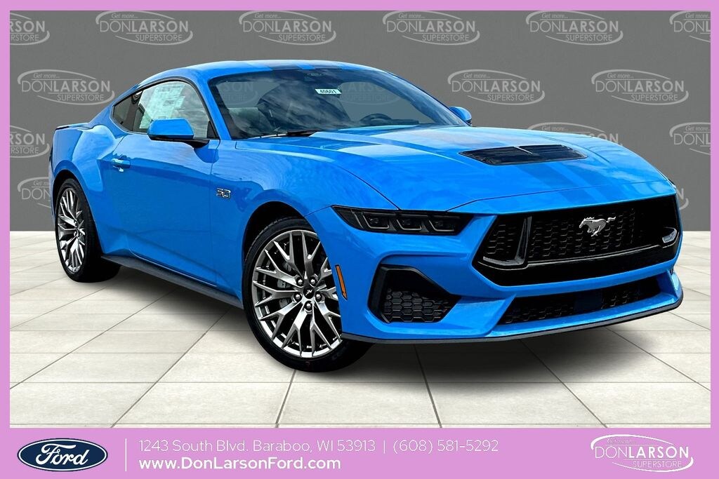 Recent Arrival! Grabber Blue Metallic 4-Wheel Disc Brakes, ABS brakes, Air Conditioning, Alloy wheels, AM/FM Stereo, Auto High-beam Headlights, Automatic temperature control, Brake assist, Bumpers: body-color, Compass, Delay-off headlights, Driver door bin, Driver vanity mirror, Dual front impact airbags, Dual front side impact airbags, Electronic Stability Control, Emergency communication system: 911 Assist, Exterior Parking Camera Rear, Four wheel independent suspension, Front anti-roll bar, Front Bucket Seats, Front Center Armrest, Front dual zone A/C, Front reading lights, Fully automatic headlights, Illuminated entry, Knee airbag, Leather Shift Knob, Leather steering wheel, Low tire pressure warning, Occupant sensing airbag, Outside temperature display, Overhead airbag, Overhead console, Panic alarm, Passenger door bin, Passenger vanity mirror, Power door mirrors, Power steering, Power windows, Radio data system, Rain sensing wipers, Rear anti-roll bar, Rear Parking Sensors, Rear window defroster, Remote keyless entry, Speed control, Speed-sensing steering, Speed-Sensitive Wipers, Split folding rear seat, Spoiler, Sport steering wheel, Steering wheel mounted audio controls, SYNC 4, Tachometer, Telescoping steering wheel, Tilt steering wheel, Traction control, Trip computer, Variably intermittent wipers, Voltmeter. 2025 Ford Mustang GT Premium RWD 5.0L V8 Ti-VCT