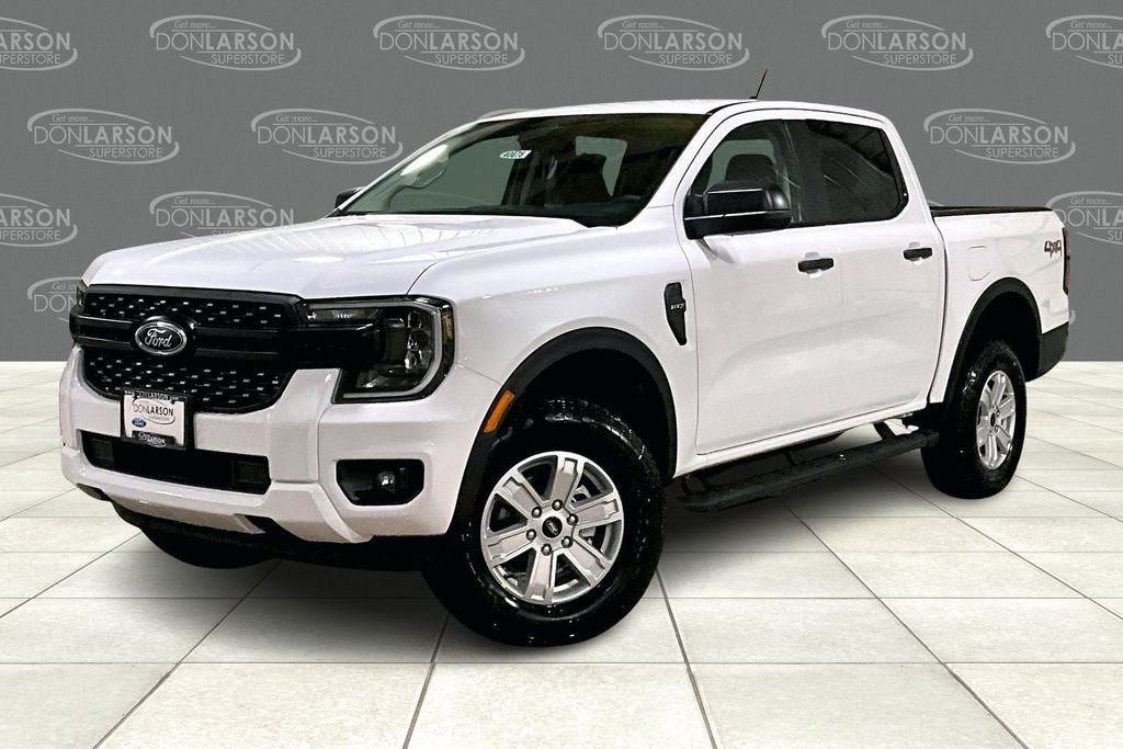 Oxford White 4WD, 3.73 Axle Ratio, 4-Wheel Disc Brakes, 6 Speakers, ABS brakes, Air Conditioning, Alloy wheels, AM/FM radio, AM/FM Stereo, Auto High-beam Headlights, Brake assist, Bumpers: body-color, Cloth Front Bucket Seats, Compass, Delay-off headlights, Driver door bin, Dual front impact airbags, Dual front side impact airbags, Electronic Stability Control, Emergency communication system: SYNC 4 911 Assist, Front anti-roll bar, Front Bucket Seats, Front Center Armrest, Front fog lights, Front reading lights, Front wheel independent suspension, Fully automatic headlights, Halogen Fog Lamps, Illuminated entry, Internet access capable: FordPass Connect 4G, LED Reflector Headlamps, Low tire pressure warning, Occupant sensing airbag, Outside temperature display, Overhead airbag, Overhead console, Panic alarm, Passenger door bin, Power door mirrors, Power steering, Power windows, Rear reading lights, Rear seat center armrest, Rear step bumper, Remote keyless entry, Security system, Speed control, Speed-sensing steering, Steering wheel mounted audio controls, STX Appearance Package, STX Fender Badge, SYNC 4A, Telescoping steering wheel, Tilt steering wheel, Traction control, Trip computer, Variably intermittent wipers, Voltmeter, Wheels: 17" Silver-Painted Aluminum, 4WD. 2025 Ford Ranger XL 4WD 10-Speed Automatic EcoBoost 2.3L I4 GTDi DOHC Turbocharged VCT