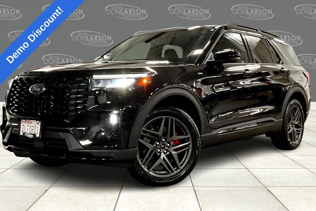Agate Black Metallic 4WD, 10 Speakers, 110V/150W AC Power Outlet, 2nd Row Captain's Chairs w/E-Z Entry and Armrest, 2nd Row Heated Seats, 3rd row seats: bench, 4-Wheel Disc Brakes, ABS brakes, Air Conditioning, Alloy wheels, AM/FM radio: SiriusXM with 360L, Ambient Lighting, Apple CarPlay/Android Auto, Auto High-beam Headlights, Auto-Dimming Interior Rear-View Mirror, Automatic temperature control, BlueCruise (equipment + 1-Year + 90-Day Plan), BlueCruise Hardware, Brake assist, Bumpers: body-color, Compass, Delay-off headlights, Driver door bin, Driver vanity mirror, Dual front impact airbags, Dual front side impact airbags, Electronic Stability Control, Emergency communication system: 911 Assist, Equipment Group 300A Standard Package, Exterior Parking Camera Rear, Four wheel independent suspension, Front anti-roll bar, Front Bucket Seats, Front Center Armrest, Front dual zone A/C, Front fog lights, Front License Plate Bracket, Front reading lights, Fully automatic headlights, Garage door transmitter, Heated door mirrors, Heated front seats, Heated steering wheel, Heated Unique Cloth Captain's Chairs, Illuminated entry, Knee airbag, Leather steering wheel, Low tire pressure warning, Manual-Folding Sideview Mirrors, Memory Driver's Seat, Navigation System, Occupant sensing airbag, Outside temperature display, Overhead airbag, Overhead console, Panic alarm, Panoramic Fixed Glass Roof with Power Shade, Passenger door bin, Passenger vanity mirror, Performance Brakes, Power door mirrors, Power driver seat, Power Liftgate, Power passenger seat, Power steering, Power windows, Premium Package, Radio: B&O Sound System by Bang and Olufsen, Rain-Sensing Wipers (front Only), Rear air conditioning, Rear anti-roll bar, Rear reading lights, Rear window defroster, Rear window wiper, Red Painted Performance Front and Rear Brake Calipers, Remote keyless entry, Security system, SiriusXM with 360L (3-Year Plan), Speed control, Speed-sensing steering, Speed-Sensitive Wipers, Split folding rear seat, Spoiler, ST-Line Street Pack, Steering wheel mounted audio controls, Tachometer, Telescoping steering wheel, Tilt steering wheel, Traction control, Trip computer, Variably intermittent wipers, Wheels: 20" Ebony-Painted Machined Aluminum, Wheels: 21" Magnetite-Painted Aluminum, 4WD. 20/27 City/Highway MPG 2026 Ford Explorer ST-Line 4WD 10-Speed Automatic 2.3L EcoBoost I-4